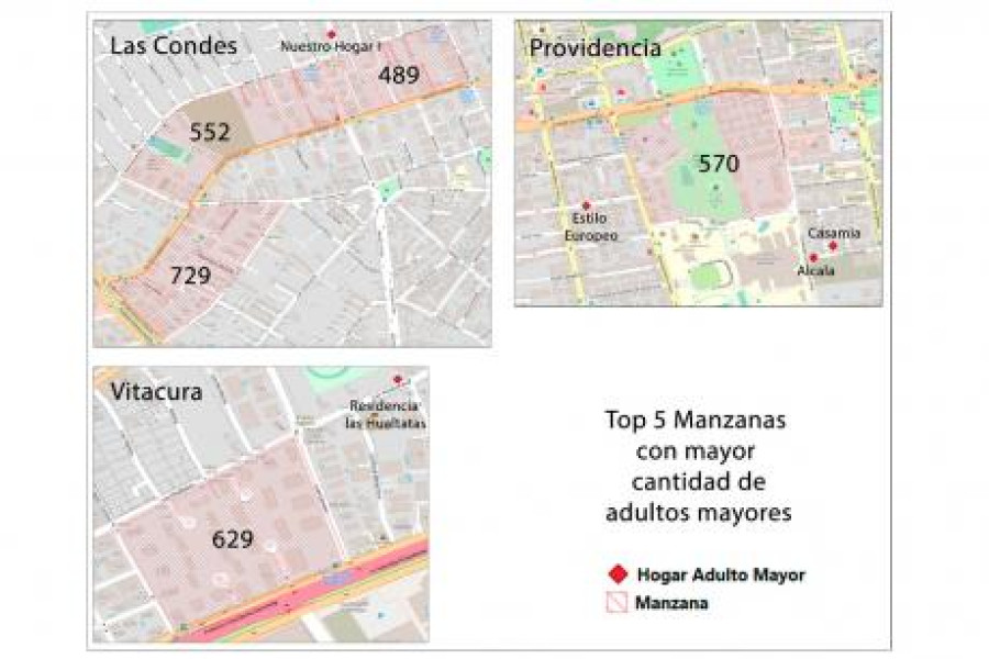 La manzana con mayor densidad de adultos mayores corresponde a la comprendida entre avenida Cristóbal Colón, Américo Vespucio, Martín Alonso Pinzón y Vasco da Gama, en la comuna de Las Condes, con 729 personas mayores de 65 años.