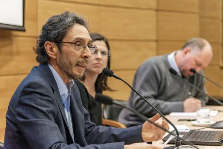 El Director del Centro de Estudios Enzo Faletto compartió en la mesa de discusión con los profesores Pedro Emilio Pérez, médico y académico del Departamento de Medicina Interna de la Facultad de Medicina de la Pontificia Universidad Católica de Chile; Alejandra Carrasco, académica del Instituto de Filosofía de esa misma Casa de Estudios, y Sylvia Eyzaguirre, investigadora del CEP.