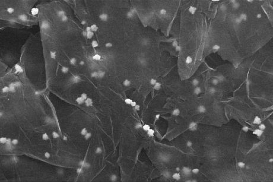 Volviendo al ejemplo de la torta de panqueques, sería como despegar cada lámina y procurar que quedaran separadas para aprovechar la superficie de cada capa. Esas láminas separadas por oxidación, son luego “decoradas” con nanopartículas de diversos materiales con el objetivo de poner separadores que impidan que se vuelvan a pegar. El procedimiento concluye con la “reducción” o eliminación del oxígeno sobrante del procedimiento, dejando como resultado, oxido de grafeno reducido decorado, es decir, grafeno con restos de óxigeno que son irrelevantes, y decorado con nanopartículas que contribuyen significativamente en las propiedades propias del grafeno.