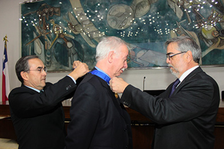 El destacado científico inglés, profesor de la Universidad de Manchester, Inglaterra, e investigador de la ciencia de los materiales, Dr. George Edwards Thompson, fue distinguido con el grado de Doctor Honoris Causa, máxima distinción que nuestra Casa de Estudios Superiores otorga a aquellas personalidades que han contribuido de manera relevante al desarrollo de la cultura y las ciencias a nivel mundial.La distinción fue otorgada este miércoles (30) en nuestro Salón de Honor, en ceremonia presidida por el rector del Plantel, Dr. Juan Manuel Zolezzi Cid, con la presencia de las más altas autoridades institucionales.En su alocución, el rector Zolezzi, sostuvo que la presencia del Dr. Thompson en la Universidad, “realza la imagen de nuestra Facultad de Ingeniería –Unidad que solicitó la distinción- y de nuestra Casa de Estudios Superiores”.“Para nosotros, como institución más que centenaria, donde el quehacer se concentra en la formación de las y los estudiantes, la visita del Dr. Thompson constituye un honor y significa recibir una bullente y poderosa brisa de vida e impulso a nuestra labor diaria”, señaló la autoridad del Plantel.“Nuestra Casa de Estudios trabaja para que sus jóvenes abran sus mentes a todo lo que su curiosidad les demande, por tanto, recibir a tan digno exponente de lo que constituye ser un verdadero maestro, sin duda, sirve para motivar a nuestros jóvenes”, agregó el rector Zolezzi.Tras la lectura oficial de la resolución que confiere el grado de Doctor Honoris Causa, a cargo del secretario general de nuestro Plantel, abogado Gustavo Robles, y luego de la entrega de la medalla y diploma que simbolizan la distinción, el profesor George Edwards Thompson se manifestó “honrado” ante el alto reconocimiento conferido por nuestra Casa de Estudios.“Agradezco a esta Universidad por esta distinción e invito a sus estudiantes a comprometerse con el estudio de los materiales, ciencia de vital importancia para nuestra vida cotidiana y para el mundo del futuro”, manifestó George Edwards Thompson, nuevo Doctor Honoris Causa, registrado en el libro de oro de nuestra Casa de Estudios Superiores.Contribución ampliamente reconocidaGeorge Edwards Thompson es ingeniero metalúrgico de la Universidad de Nottingham, Inglaterra, y doctor y postdoctorado en mención Metalúrgica Física en la misma universidad.Actualmente, es profesor titular del Centro de Corrosión y Protección de la Universidad de Manchester, Inglaterra, y destacado investigador en la disciplina de Ingeniería y Ciencias de la Corrosión.La trayectoria del doctor Thompson se ha desarrollado en el campo de las investigaciones en ciencias de la ingeniería y en la formación de recursos humanos al más alto nivel. Además, ha contribuido con su experiencia en entidades públicas y privadas en Europa, América y Chile.Su obra científica comprende más de 600 artículos en revistas ISI y numerosos capítulos de libros donde aborda problemáticas básicas y aplicadas en las áreas de corrosión, electroquímica y materiales.Los méritos y contribuciones del Dr. Thompson, lo han hecho merecedor de importantes premios internacionales que han sido otorgados desde 1967 en más de 17 oportunidades por diferentes entidades, tales como la Asociación Europea de Corrosión, la Sociedad Internacional de Electroquímica, la Federación Británica de Hierro y Acero, el Instituto de Metales y la Sociedad de Industrias Químicas, entre otras.Asimismo, el profesor Thompson ha aportado en forma relevante al entendimiento de los procesos de corrosión y protección de materiales para aplicaciones aeronáuticas, particularmente de las aleaciones de aluminio, desarrollando técnicas que han permitido establecer los primeros modelos en el crecimiento de películas anódicas en estos materiales, recibiendo en el 2000 el premio OBE, para la investigación al servicio de las industrias de defensa por tales contribuciones, distinción otorgada por la Reina Isabel.Todos estos logros y contribuciones a las ciencias, fueron determinantes para otorgar el grado de Doctor Honoris Causa de la Universidad de Santiago de Chile a este científico e investigador, reconocido en nuestro país y en todo el mundo.