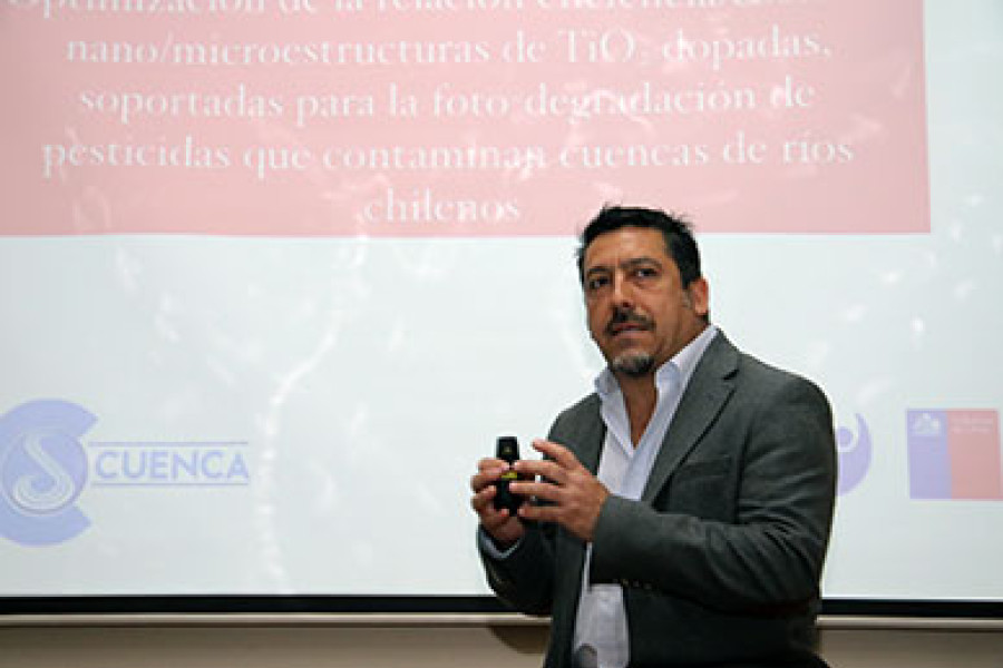 El proyecto liderado por el Dr. Diego Venegas-Yazigi (en la fotografía), de la Facultad de Química y Biología e integrante del Centro para el Desarrollo de la Nanociencia y la Nanotecnología (CEDENNA), mejoró la eficiencia de un material que tiene como base óxido de titanio, optimizado para remover residuos orgánicos en aguas de riego mediante la utilización de la luz solar. La iniciativa se enmarcó en un proyecto CORFO que fue acompañado por la empresa H2Cuenca, consultora con vasta experiencia en ingeniería y recursos hídricos, vinculada a la Comisión Nacional de Riego.