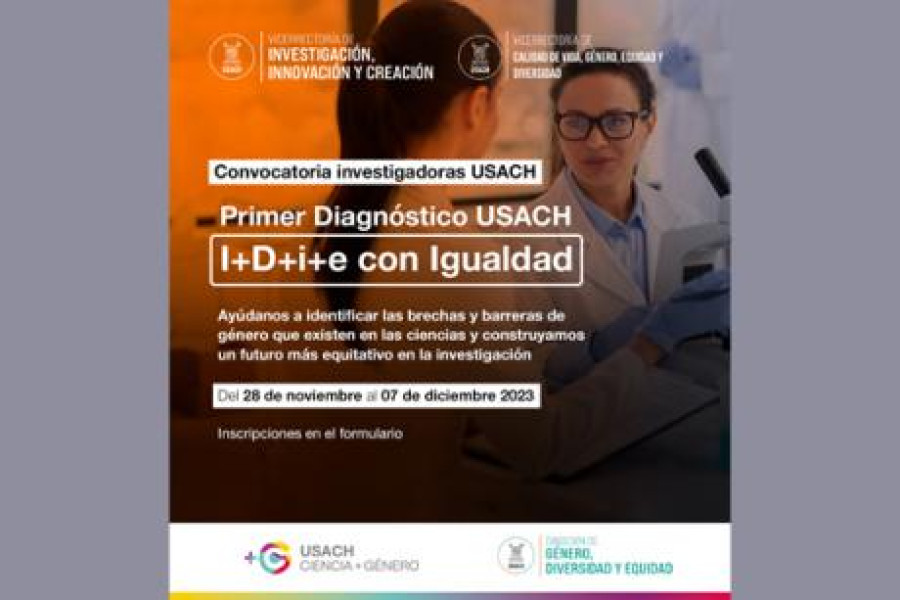 La Vicerrectoría de Investigación, Innovación y Creación, en colaboración con la Vicerrectoría de Calidad de Vida, Género, Equidad y Diversidad, invitan a las académicas investigadoras de la Usach a participar del Primer Diagnóstico institucional en "I+D+i+e con Igualdad".