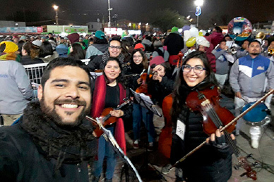 Una destacada participación en las principales Eucaristías de la Fiesta de La Tirana tuvo la Camerata Estudiantil de la U. de Santiago, dependiente de la Vicerrectoría de Apoyo al Estudiante, a través de los Elencos Vocacionales de la Unidad de Vocación Artística.Así lo dio a conocer el director de la Orquesta y Coro del Ministerio de Música del Santuario de Nuestra Señora del Carmen de La Tirana, Mario Villalba Pedreros, quien por segundo año consecutivo invitó a participar de los preparativos y la celebración a la Camerata, “considerando su excelente participación, en su versión anterior”, indicó a través de una misiva.Fue así como entre el 10 al 19 de julio, ante más de 270 mil fieles que llegaron a rendir homenaje a la Virgen del Carmen, seis jóvenes estudiantes de nuestra Casa de Estudios, guiados por su director Ernesto Parra Navarrete, viajaron hasta la localidad de la Tirana ubicada en la Región de Tarapacá, para sumar sus violas, violines y un chelo, a la Orquesta del Santuario, compuesta por 170 músicos jóvenes.Tras su destacada participación, el director de la Camerata estudiantil de la U. de Santiago, explicó que “es fundamental en esta Fiesta, ampliar la cultura musical de nuestros estudiantes, y el prestigio que adquiere nuestra Universidad”. Puesta en escena Gracias a la estrecha relación existente entre el director musical de la Orquesta del Santuario y el director del Elenco Vocacional del Plantel, se mantiene la participación de la Camerata en este importante evento nacional, que convoca a miles de peregrinos chilenos y extranjeros en medio de la Pampa del Tamarugal a celebrar el cumpleaños de la Chinita, como se le conoce localmente.Fue así, como durante la extensión de la festividad religiosa, los jóvenes músicos de nuestra Casa de Estudios, participaron en misas preparatorias, centrales y de cierre, en capillas grandes y pequeñas.El Elenco Vocacional, compuesto por seis estudiantes, y su director se sumó así a la Orquesta del Santuario compuesta por 170 músicos provenientes de distintas regiones, quienes son invitados especialmente a participar de la tradicional fiesta, que se ha convertido en la más atractiva del norte del país.En la instancia, las cuerdas frotadas se incorporaron al programa de la misa, compartiendo las partituras entregadas por el directorio de la Orquesta, en donde destacan "Gloria”, “Credo”, entre otros, interpretados con un compás distinto al tradicional, cargado de percusiones. Asimismo, el director de la Camerata fue invitado a dirigir parte de las misas.Respecto a la participación de los estudiantes del Plantel, el director del Elenco Vocacional explica que se trata de jóvenes que no son músicos, si no estudiantes de distintas carreras que han participado en orquestas juveniles y tomaron los cursos de formación integral que ofrece la Universidad.“Creo que es muy importante que los estudiantes conocieran todo este sincretismo que se proyecta. Creo que es fundamental en esta Fiesta, ampliar la cultura musical de nuestros estudiantes, y el prestigio que adquiere nuestra Universidad”, afirma el director. Ampliando la cultura musical Jornadas marcadas por más de 300 cofradías religiosas, más de 15 mil bailarines y 170 músicos participaron en la ceremonia con carácter sagrado, que se celebra desde el año 1910.En ese contexto, tuvo una destaca participación nuestra Camerata Estudiantil, creado para estudiantes con conocimientos musicales previos en instrumentos musicales o con experiencia en orquesta infantil o juvenil.Ruth Páez Hurtado (23), es estudiante de Tercer Año de Arquitectura, y toca violín en el Elenco. Según relata, es la primera vez que participa en una festividad de este tipo, pese a que ha participado en orquestas municipales desde los 14 años.Respecto a su participación en la festividad, explica que “fue una experiencia satisfactoria en el sentido cultural, de compañerismo, de conocer el nivel de compromiso de la Universidad con sus estudiantes, para que participen de estas actividades”.Gabriel Moreno Maluenda (22), es otro estudiante del Plantel, que toca violín en el Elenco. En Cuarto Año de Ingeniería Civil Química, participa de la Camerata desde el primer semestre en que entró a la Universidad.Según cuenta, toca violín desde los siete años, y al enterarse que existían los Elencos solicitó su incorporación. “La Universidad, a través de la unidad de vocación artística nos entrega harto apoyo que es muy importante, y eso permite que los estudiantes se motiven desde mucho antes, y sienten los beneficios que entrega la universidad a quienes son sus representantes”, puntualiza el estudiante.