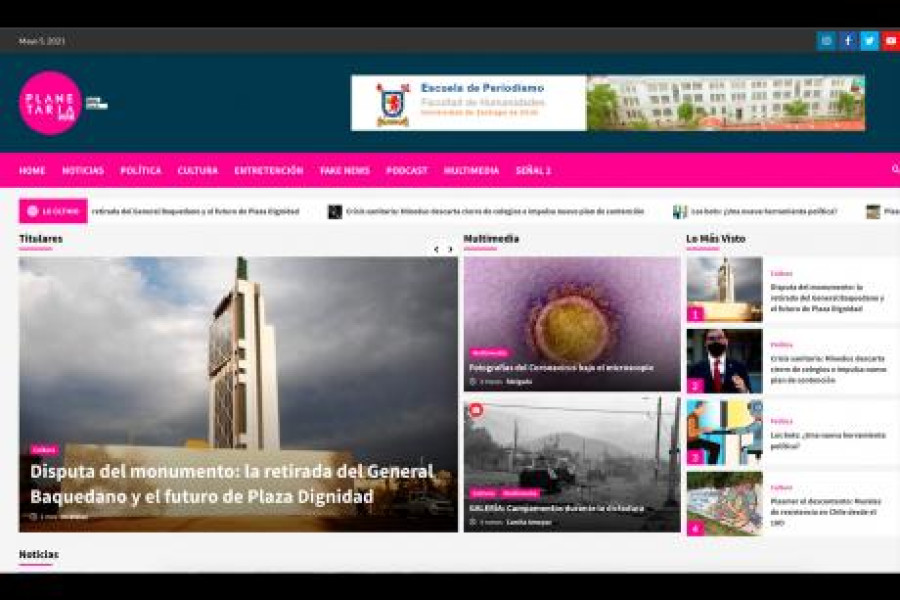 A través de una ceremonia virtual, se lanzó el sitio web de la Escuela de Periodismo, Radio Planetaria Señal 2, diseñado y desarrollado por las y los estudiantes de dicha carrera diurna, en el marco del programa de Periodismo Digital I y II. El espacio cuenta con informaciones de actualidad, cultura, política, entretención, Fake News y podcast.La actividad contó con la participación de autoridades como la decana de la Facultad de Humanidades, Dra. Cristina Moyano; el director de la Escuela de Periodismo, Dr. René Jara; el jefe de carrera, Dr. Antoine Faure, y la invitada especial al evento, la ex directora de prensa de “El Desconcierto”, Francisca Quiroga.La decana Moyano felicitó el desarrollo de esta iniciativa “que genera impacto real en la vida social y que permitirá la creación de un sitio donde los saberes no quedarán en los marcos restrictivos de una evaluación más”.“Este laboratorio basado en premisas de una pedagogía auténtica me parece excelente y tiene por delante una serie de desafíos que seguramente pondrán a la Escuela de Periodismo de la U. de Santiago como un referente en el área”, añadió.La Dra. Moyano declaró que espera que esta iniciativa siga creciendo y se fortalezca en el tiempo. “Para ello cuentan con el apoyo que puede brindarles la Facultad de Humanidades y, en ese contexto, les deseo el mejor de los éxitos y reitero mis felicitaciones por atreverse a innovar”, sostuvo.Con el desafío de impartir clases en pandemia, en formato taller, y un fuerte trabajo en coordinación, la periodista y profesora de la Escuela, Mónica Ventura, destacó el trabajo de las y los estudiantes al asumir el sitio como algo propio y también “como periodistas de Radio Planetaria”.“Armar este proyecto, este sitio, fue un desafío bastante grande y nos sentimos orgullosos junto a los profesores que trabajaron en esta creación porque logramos un resultado, un producto que ellos pueden usar de aquí a los siguientes cursos y es algo que va a quedar en la Escuela. Espero que lo podamos ir mejorando”, agregó.Un espacio de reflexión, de crítica y de análisisBajo esa misma línea, el director de la Escuela de Periodismo, Dr. René Jara, subrayó la labor de la profesora Ventura, quien supervisó la iniciativa en el curso regular de Periodismo Digital, con el apoyo de dos docentes de la especialidad de cultura y política, la Dra. Constanza Symmes y el Dr. David Jofré, respectivamente.“Desde la idea, el diseño e implementación de este sitio, las y los estudiantes de este curso fueron concebidos como el elemento central para su desarrollo. Las gráficas, la estructura, y por supuesto los contenidos, han sido pensados en y con ellas y ellos, de modo tal que las experiencias documentan un proceso de aprendizaje significativo que se desarrolla durante el semestre”, indicó.La autoridad académica también destacó el rol de los medios independientes y los y las periodistas en la actualidad, contexto en el que se levanta Radio Planetaria como un espacio para informarse, reflexionar, y también de crítica y análisis.“Lo fundamental serán las próximas generaciones de profesores y estudiantes quienes tendrán que asumir la responsabilidad en mantener activo este sitio, de hacerlo crecer, y de perfeccionar sus impactos con el objetivo de contribuir a un mejor proceso de formación”, concluyó Jara.Para visitar el sitio web oficial, puedes ingresar aquí: http://planetaria.usach.cl/