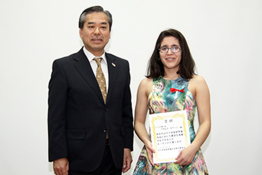La estudiante de tercer año de Licenciatura en Lingüística Aplicada a la Traducción Inglés Japonés Macarena Casanova (en la fotografía, junto al embajador japonés, Yoshi Hiraishi), obtuvo el primer lugar en el concurso de Oratoria en Idioma Japonés 2017”; esto, en la categoría avanzada, y su compañera Florencia Santamaría, el tercero en el nivel intermedio. Este emblemático certamen, que lleva desarrollándose por más de dos décadas, pone en valor la cultura japonesa, y brinda la oportunidad de aplicar y mostrar los conocimientos adquiridos por aquellas personas que estudian el idioma nipón en Chile.