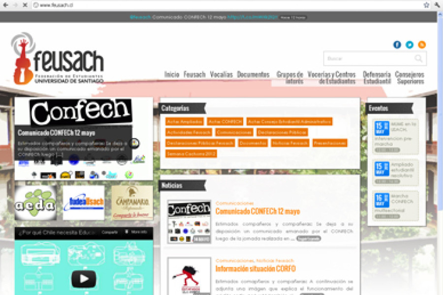 A juicio de los dirigentes estudiantiles contempla los cambios de paradigma y las necesidades que exigen las nuevas tecnologías; entre ellas ser un sitio amigable y adaptable a distintos dispositivos móviles.Orgullosos están los integrantes de la directiva de la Federación de Estudiantes de nuestro plantel (Feusach) con su nueva plataforma Web www.feusach.cl, que a juicio de los dirigentes estudiantiles contiene nuevos elementos que tendrán un gran impacto en la comunidad.El secretario general de la Feusach, Francisco Acuña, recalcó que el nuevo sitio contempla los cambios de paradigma y las necesidades que exigen las nuevas tecnologías de la Web, “específicamente la necesidad de tener un sitio amigable y adaptable a distintos dispositivos como smartphones, ipod, ipad, Tablet, netbook, notebook y computadores con monitores de alta resolución".El estudiante precisó que el nuevo sitio fue creado “gracias al potencial de los estudiantes de la Universidad”, ya que fue desarrollado por Camilo Farfán y Danilo Aburto, jóvenes  pertenecientes al Departamento de Ingeniería Informática.“Mediante la aplicación de su conocimiento, su motivación y su emprendimiento fueron capaces de generar este nuevo sitio para la Federación de Estudiantes, el cual, creemos, será una herramienta muy provechosa para toda la comunidad estudiantil”, concluyó el secretario general de la Feusach.www.feusach.cl