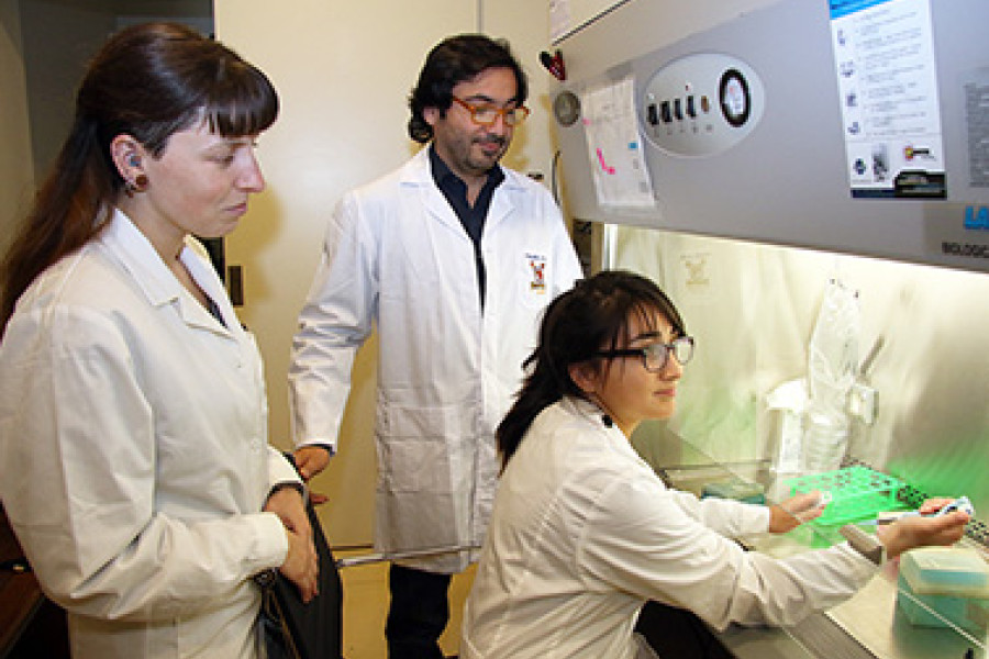Con el objetivo de buscar soluciones a problemáticas universales y facilitar el acceso a la salud de manera general, el Laboratorio de Bioterapias de nuestra Casa de Estudios a cargo del Doctor en Ciencias Biomédicas Claudio Acuña Castillo, se ha especializado –dentro de una de sus líneas de investigación- en el desarrollo de nuevas terapias inmunológicas antitumorales.Entre éstas, innova particularmente el desarrollo de una composición farmacéutica para el tratamiento del tumor, que busca que los tumores expresen proteínas virales que permitan su posterior destrucción.Lo anterior se realiza mediante una inyección intratumoral de nanopartículas de quitosano que contienen genes de proteínas fusión viral en los tumores, para llevar a que estos posteriormente las expresen. En este proyecto participan la bioquímica por nuestro Plantel Giselle Sánchez Guerrero y la candidata a doctora en Microbiología, Claudia Robles Planells.La línea de trabajo que comenzó el año 2014 con las tesis de ambas investigadoras pertenecientes al Laboratorio, busca controlar el desarrollo tumoral, crear respuestas inmunes o ambos, y probar su efectividad en el tratamiento del cáncer, y recientemente obtuvo importantes resultados preliminares.Así lo explica Claudia Robles, quien comenta los principales resultados provenientes de estudios preclínicos realizados en animales con melanoma y cáncer de Colon: “en ambos caso se obtuvo un retraso en el crecimiento. Es decir, los tumores crecen más lento que los tumores no tratados, e incluso hay casos en que el tumor desaparece luego de ser tratado”, sostiene.Según explica el Dr. Acuña, la viroterapia es considerada una posible candidata aún en fase de investigación que podría ser otro tratamiento alternativo para atacar el cáncer, por lo que sería una importante contribución si se profundizara en los estudios, para lo cual recientemente postularon a un Concurso Abierto de la DGT, y se encuentran en fase de patentamiento ante Inapi.Respecto al proyecto, el científico afirma que el objetivo es generar un tratamiento inyectable en el tumor que permita inducir la expresión de genes de proteínas de fusión virales como un mecanismo general de destrucción de tumores de mamíferos.“Buscamos generar un producto de uso universal y no particular, que induzca al organismo infectado a generar una respuesta, tal como ocurre en las respuestas a patógenos”, puntualiza.ProyectoInteresados en el desarrollo de nanopartículas de quitosano y proteínas virales, la estudiante Giselle Sánchez realizó su tesis de pregrado en “uso de nanopartículas como método: de transfección in vivo”, estudios que más tarde serían complementados con la tesis de Claudia Robles, quien ha trabajado en la “expresión de proteínas de fusión viral en células tumorales, como mecanismo para inducir una respuesta antitumoral”.Ambos estudios, han contribuido al desarrollo y avance de ésta investigación, para la cual buscaron en conjunto los métodos idóneos para hacer nanoparticulas y transfecciones.Previamente, gracias a un proyecto Fondecyt, el equipo del Dr. Acuña había caracterizado distintas proteínas, de las cuales una fue utilizada para ésta investigación, proveniente de un virus aviar, el “reovirus”.Según explica el Dr. Acuña, se han descrito varias terapias que usan virus oncolítico, que destruyen células tumorales, que no tienen la capacidad para poder reparar su DNA, haciendo que se repliquen y revienten.En ese contexto, la investigación ha buscado usar esa proteína, inyectarla al tumor, y buscar que las células la expresaran.Con ese mecanismo, el investigador explica que lo esperable es que: “luego se fusionen, generen células grandes y se destruyan, provocando un proceso inflamatorio y obligando al sistema a reclutar una respuesta inmunológica y gatillar de esa forma una respuesta antitumoral de forma totalmente inespecífica mediada por la destrucción de estas proteínas virales”, concluye.