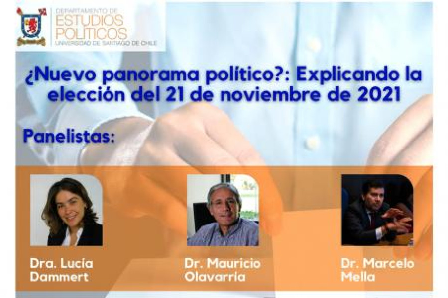 Este jueves 25 de noviembre, a las 12 horas, el Departamento de Estudios Políticos de nuestra Universidad reunirá a los/as académicos/as Dra. Lucía Dammert, Dr. Marcelo Mella y Dr. Mauricio Olavarría, en un seminario virtual que busca analizar y explicar los resultados del pasado domingo.