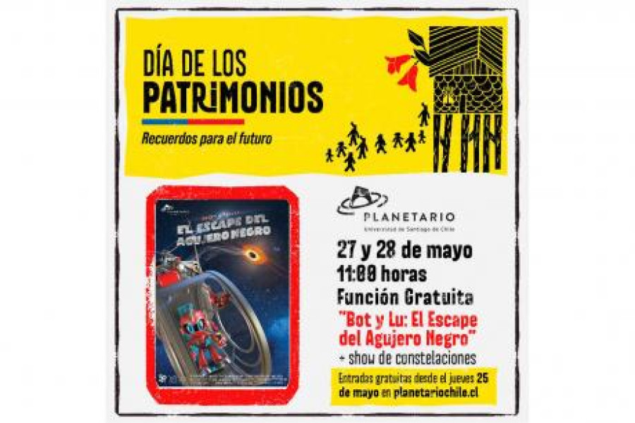 ¡Ven a vivir una gran aventura por el Sistema Solar!, es el slogan con el que Planetario Usach se suma al Día de los Patrimonios 2023 este fin de semana.Para ello ofrecerá funciones gratuitas de su película “Bot y Lu: El Escape del Agujero Negro” y el tradicional show de constelaciones a cargo del clásico proyector óptico Carl Zeiss VI.La película infantil cuenta la historia de Bot, un pequeño robot que sueña con conocer el Universo, y Lu, una inteligente chinita que le enseña sobre este.Ambos, a bordo de una nave espacial, emprenderán una gran aventura por nuestro Sistema Solar, acercándose peligrosamente hacia el centro de la Vía Láctea donde se enfrentarán a los peligros de los agujeros negros, además conocerán diferentes planetas, aprenderán sobre la fuerza de gravedad y otros interesantes temas relacionados con el Universo.Las entradas se podrán adquirir de manera online a partir de mediodía de este jueves 25 de mayo en el sitio web www.planetariochile.cl