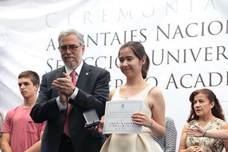 Luego de compartir con estudiantes y familiares asistentes a la ceremonia de reconocimiento organizada por el Cruch en la UMCE, cuyo objetivo es destacar el logro de quienes obtuvieron los máximos puntajes en las distintas Pruebas de Selección Universitaria, el Rector Dr. Juan Manuel Zolezzi Cid, precisó que “el paso por la universidad no debe limitarse a lo estrictamente académico, pues se trata de una gran oportunidad para fortalecer las capacidades y explotar al máximo las potencialidades, idealmente como un aporte al país”. En la fotografía, el Rector Zolezzi junto a Fernanda Herrera Villar, mejor promedio de la Pruebas de Selección Universitaria.
