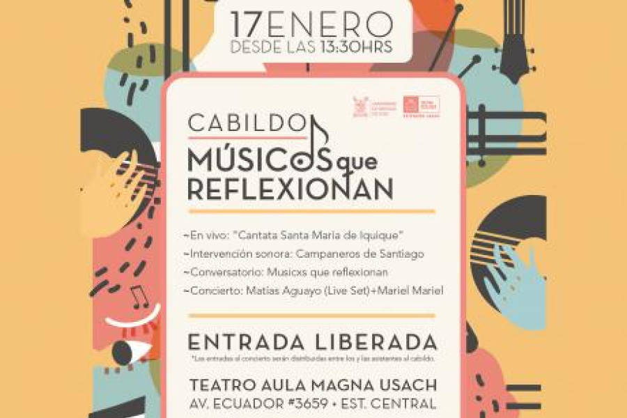 La interpretación de la Cantata Santa María de Iquique, en el marco del Vigésimo Festival Internacional de Música Contemporánea; un cabildo con diferentes gestores culturales y artistas; y los conciertos de Mariel Mariel y Matías Aguayo, formarán parte de las actividades gratuitas que se desarrollarán el próximo viernes 17 de enero, en el marco del encuentro “Músicxs que reflexionan”, en el Teatro Aula Magna Usach.